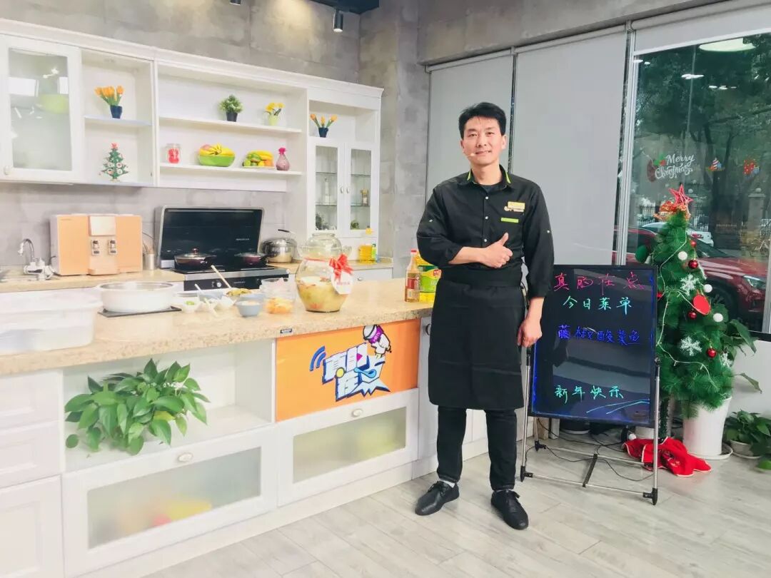 杨俊,44岁,湖北孝感人,因兴趣爱好从事餐饮业,至今已有8年。现场他为我们制作了一道招牌菜———藤椒酸菜鱼火锅。
